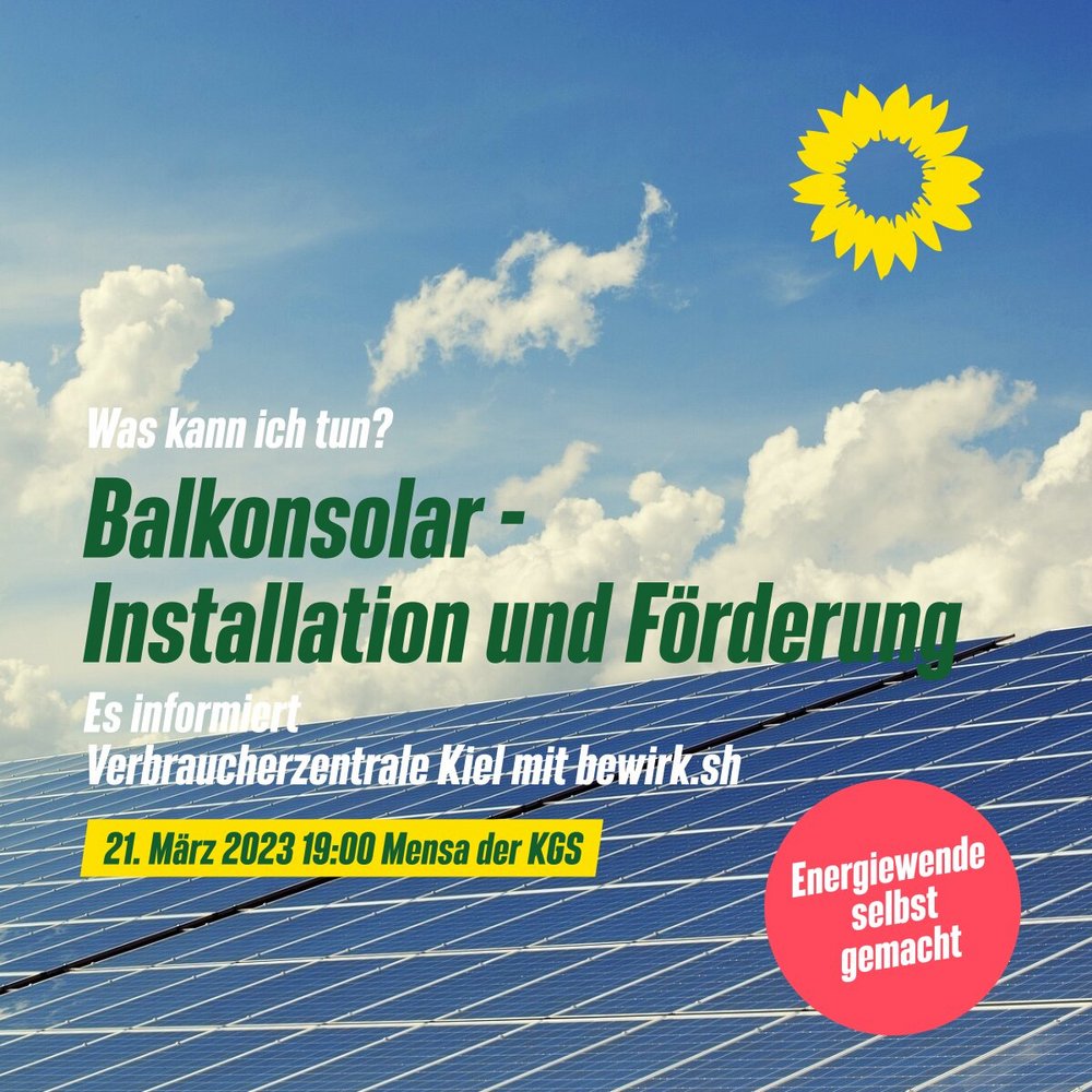 Unter dem Motto: „Energiewende selbst gemacht“ veranstalten die Grünen am Dienstag, 21. März 2023 um 19:00 eine Informationsveranstaltung zum Thema Balkonsolaranlagen in der Mensa der KGS.