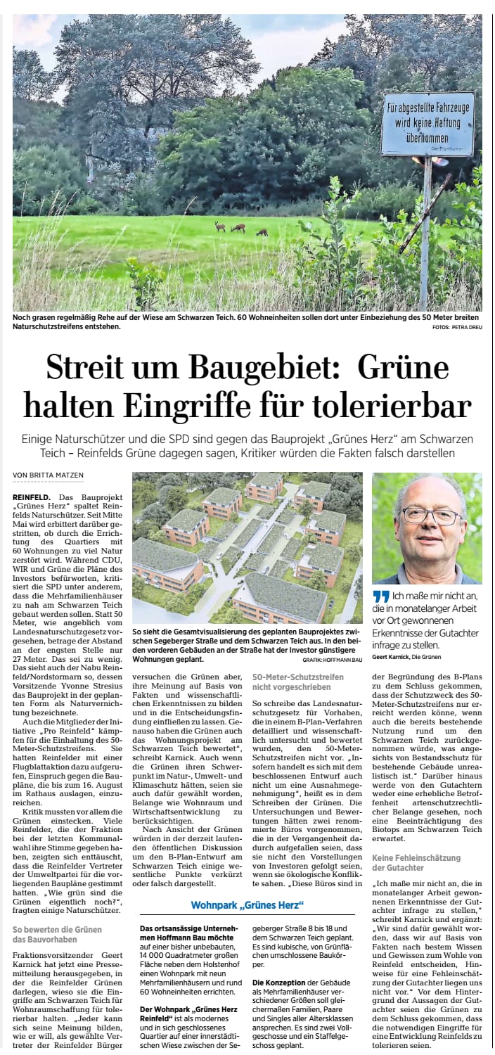 Jeder kann sich seine Meinung bilden, wie er will, als gewählte Vertreter der Reinfelder Bürger versuchen die Grünen aber, ihre Meinung auf Basis von Fakten und wissenschaftlichen Erkenntnissen zu bilden und in die Entscheidungsfindung einfließen zu lassen. Genauso haben die Grünen auch das Wohnungsprojekt am Schwarzen Teich bewertet. Auch wenn die Grünen ihren Schwerpunkt im Natur-, Umwelt- und Klimaschutz haben, sind sie auch dafür gewählt worden, auch andere Belange für Reinfeld, wie z.B. Wohnraum und Wirtschaftsentwicklung, zu berücksichtigen.