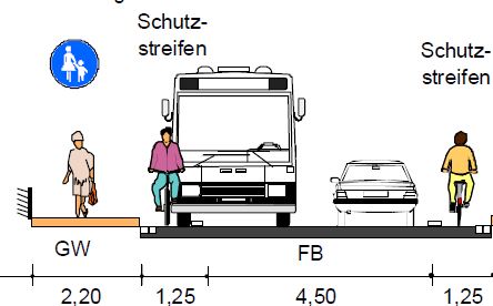 Die Grünen fordern dagegen die Einrichtung von Schutzstreifen für den Radverkehr gemäß StVO Zeichen 340, die sich für Ortsdurchfahrten und Hauptverkehrsstraßen bundesweit bewährt haben. Für die Anlage von Schutzstreifen für den Radverkehr an Ortsdurchfahrten werden von den entsprechenden Richtlinien (ERA 2010) eine Fahrbahnbreite von 7,00 m vorgegeben, je 1,25 für die beidseitigen Schutzstreifen und 4,50 m für den motorisierten Individualverkehr (siehe Abbildung).